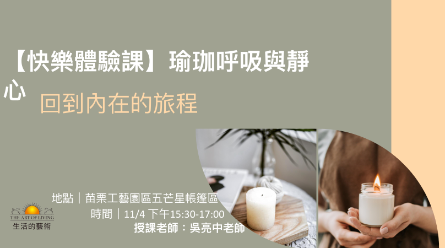 本次體驗課程,我們將簡單帶領大家體驗「瑜珈呼吸與靜心」,回到內在的旅程。