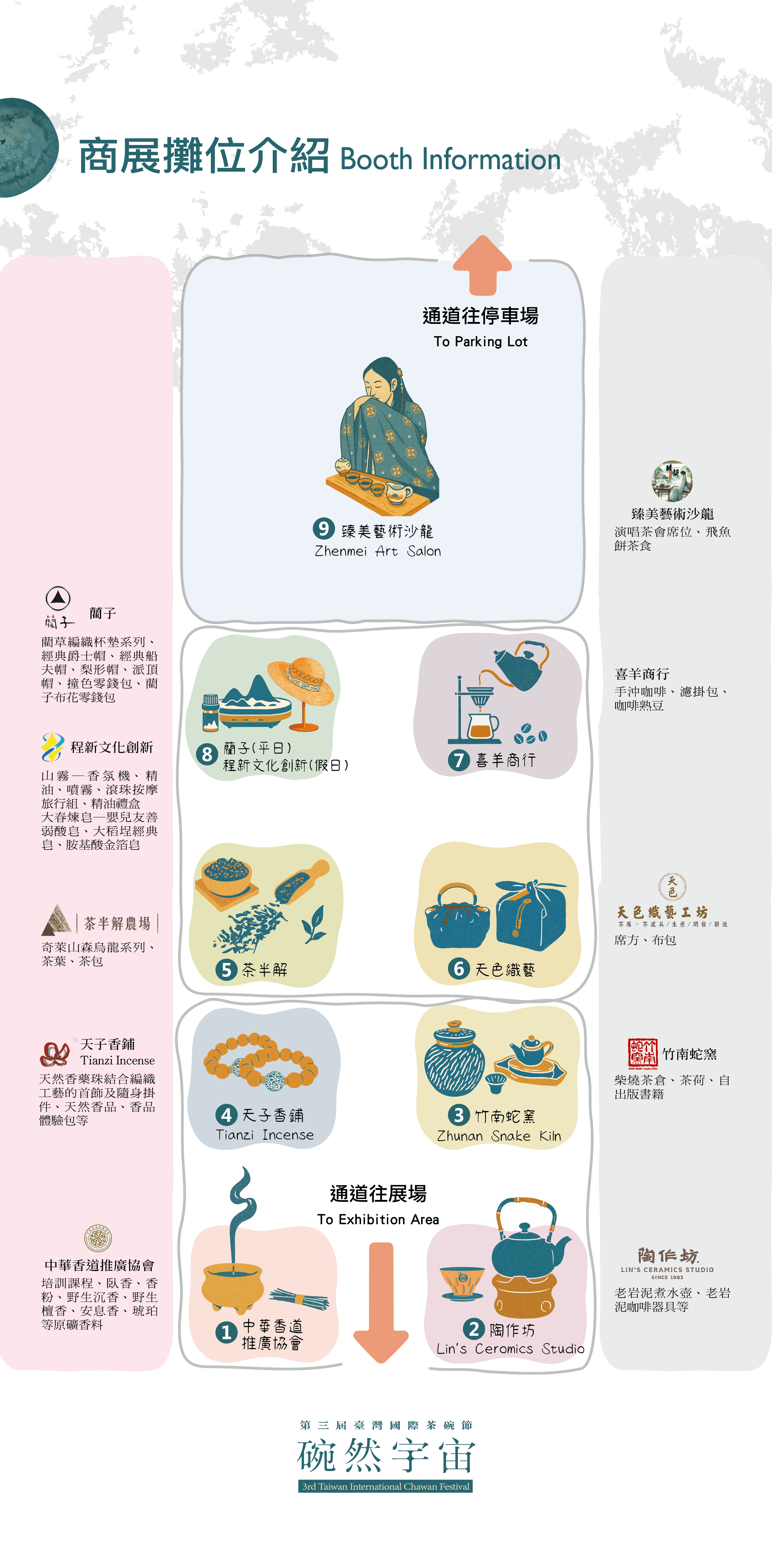 第三屆臺國際茶碗節現場的品牌進駐區域,以「茶文化與生活美學」為主軸,特別邀請十家品牌・橫跨茶席周邊道具、工藝品牌、茶、香道、藺草、咖啡、香氛、美學品牌等,希望打照更豐富多元的茶的宇宙,增加觀眾的五感體驗,從10/30-11/16日,常設於會場-苗栗工藝園區內,每天都可以來逛逛!