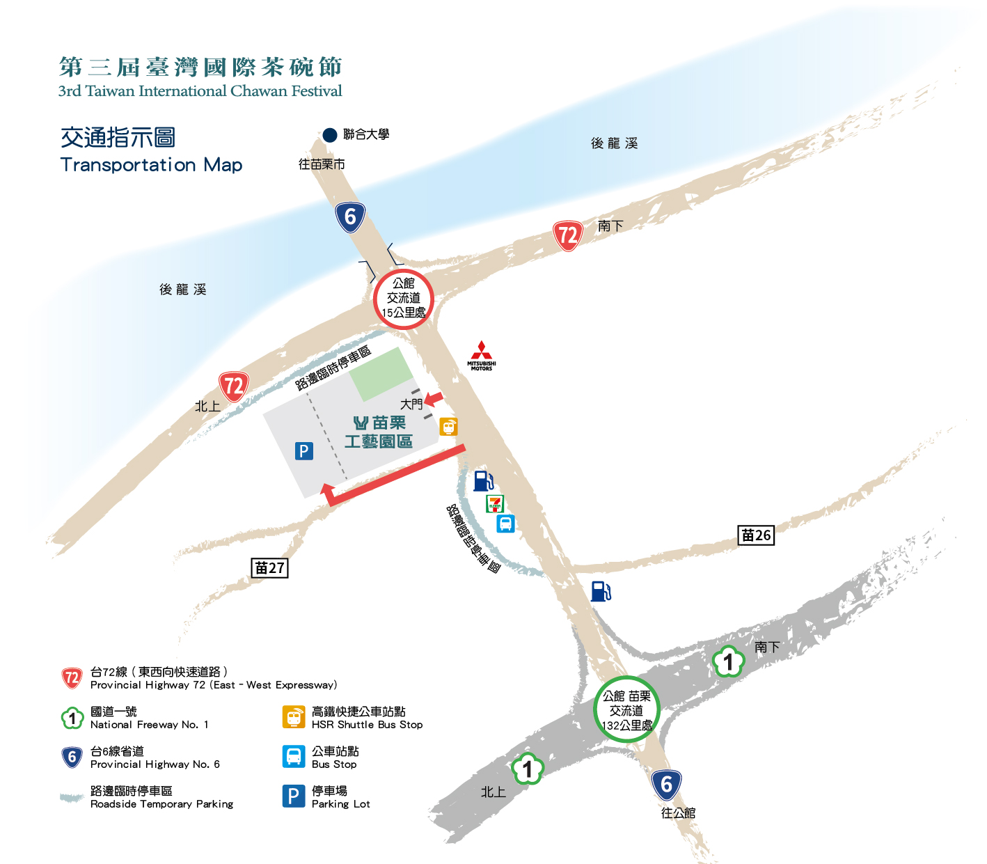 國道一號・公館苗栗132公里處下交流道,接台六線往苗栗方向約3公里,即可抵達。